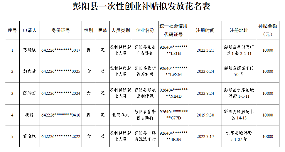 根据《关于印发〈实施重点群体创业推进行动方案〉的通知》(宁人社发〔2023〕12号)和《关于印发〈彭阳县2023年重点群体创业推进实施方案〉的通知》(彭就创办发〔2023〕7号)精神,经创业人员申报,通过工作人员审核, 现对拟发放创业补贴的苏晓强等5人予以公示,公示期为10月20日-10月27日(5个工作日)。
