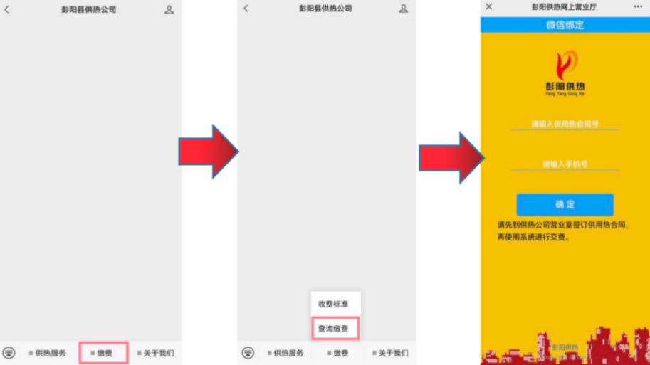 第二步:点击公众号下方中间的“缴费”—“查询缴费”进入缴费页面,输入合同号,手机号(手机号码是签订用热合同时预留手机号)。若您忘记了合同号,不用慌张,您可到供热收费大厅或拨打0954—7014599进行咨询;若您还未签订供热合同,请先到供热收费大厅签订《供用热合同》扫码绑定后交费。