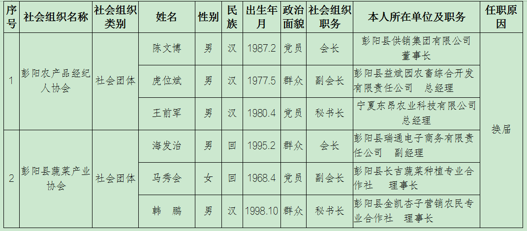 按照《社会团体登记管理相关条例》《基金会管理条例》《民办非企业单位登记管理暂行条例》以及中共中央办公厅、国务院办公厅《关于改革社会组织管理制度促进社会组织健康有序发展的意见》有关规定,经彭阳县供销合作社联合社审核,现将新任职彭阳县蔬菜产业协会、彭阳农产品经纪人协会负责人予以公示。