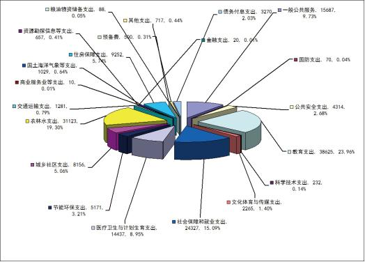 预计地方一般公共预算支出161231万元,主要支出项目为:一般公共服务支出15688万元、国防支出70万元、公共安全支出4315万元、教育支出38624万元、科学技术支出232万元、文化体育与传媒支出2265万元、社会保障和就业支出24326万元、医疗卫生与计划生育支出14437万元、节能环保支出5171万元、城乡社区支出8156万元、农林水支出31124万元、交通运输支出1282万元、资源勘探信息等支出656万元、商业服务业等支出10万元、金融支出20万元、国土海洋气象等支出1029万元、住房保障支出9252万元、粮油物资储备支出88万元、预备费500万元、债务付息支出3270万元、其他支出717万元。上解支出114万元。