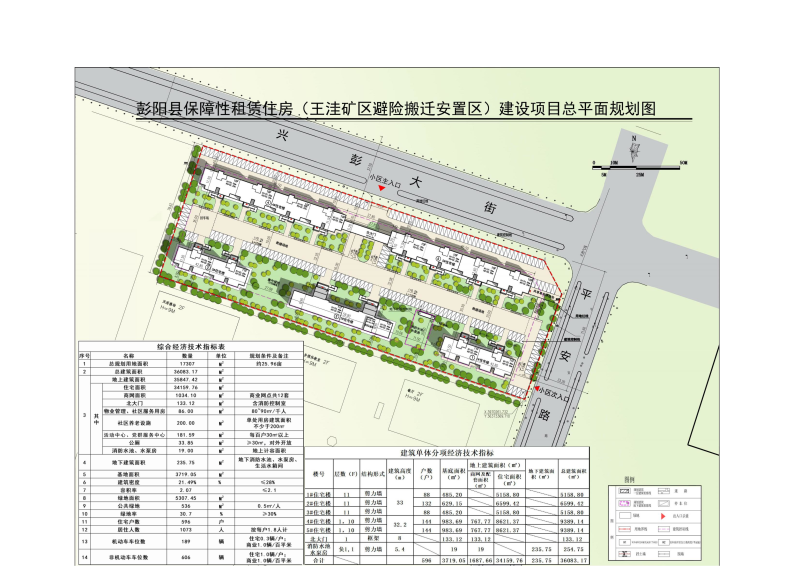 项目位于彭阳县县城西门片区,东至平安路,西至第五中学,南至第五中学,北至兴彭大街。总占地面积25.96亩,地上总建筑面积36083.17平方米,其中地上建筑面积35847.42平方米,地下建筑面积235.75平方米,容积率2.07%,建筑密度21.49%,绿地率30.7%,机动车停车位189辆,非机动车停车位606辆