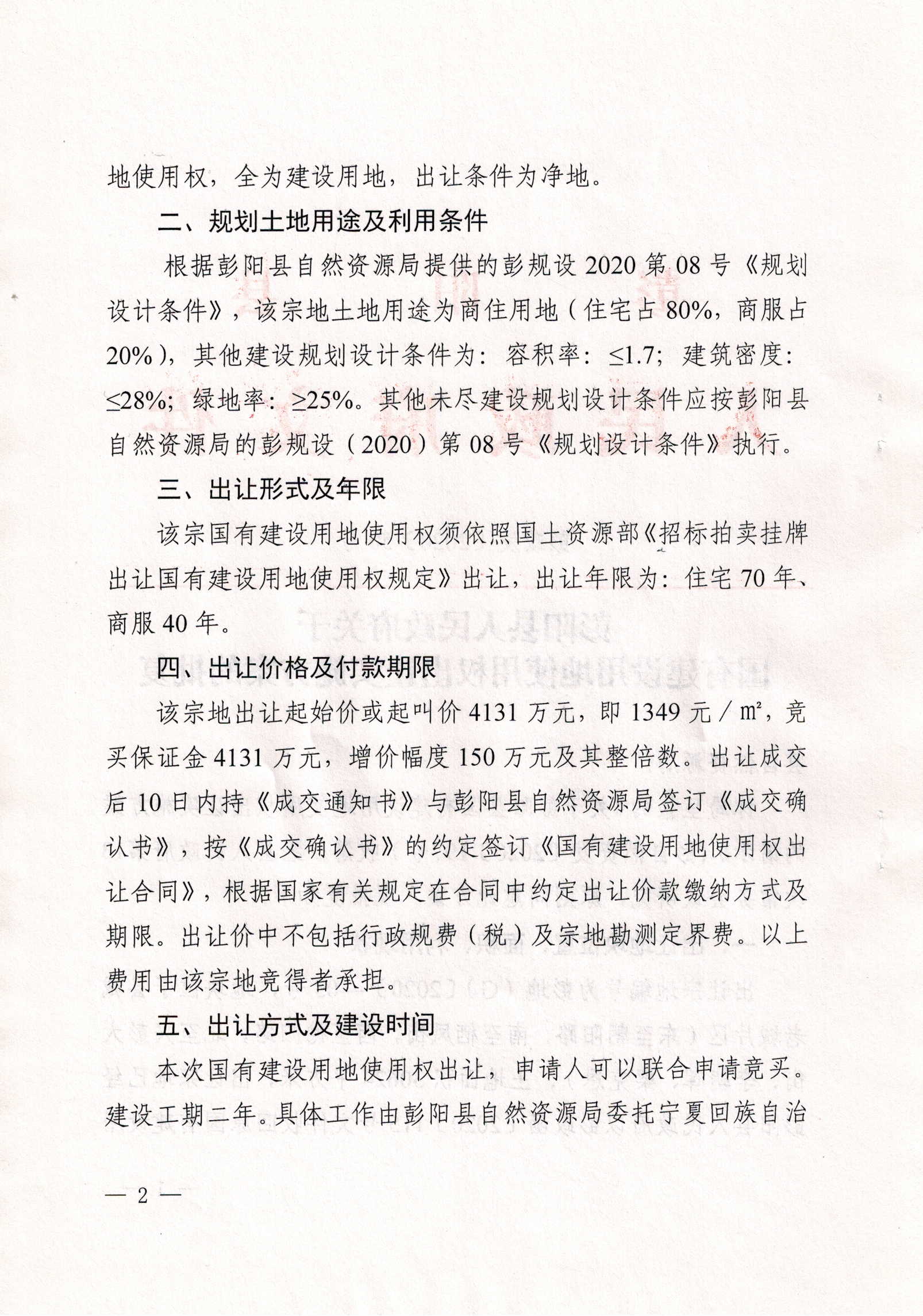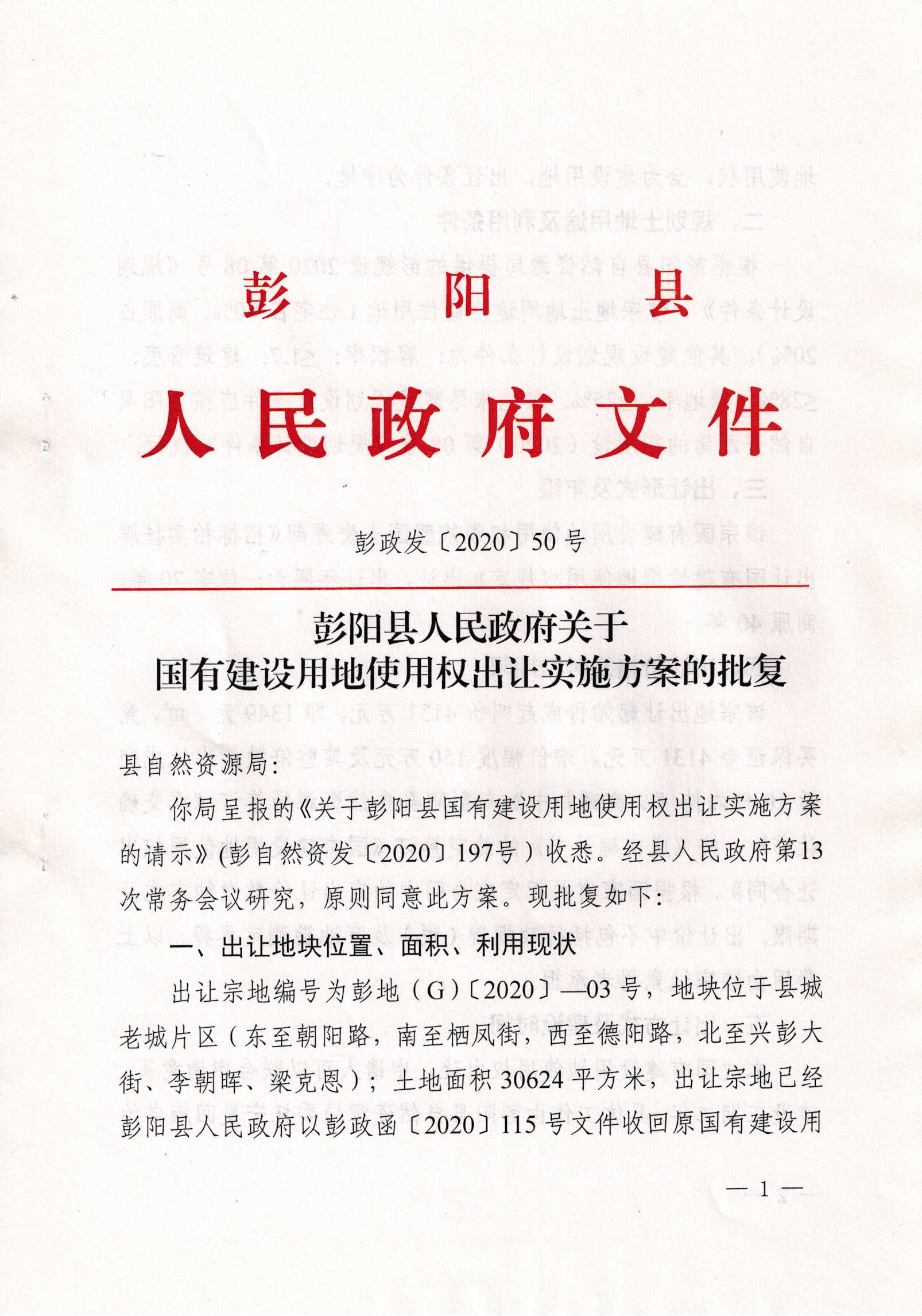 彭阳县人民政府关于国有建设用地使用权出让实施方案的批复(彭政发〔2020〕50号)