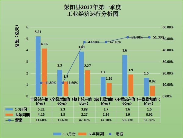 第一季度,我县规上工业完成总产值3.88亿元,预计实现增加值1.7亿元,同比增长47.1%。其中王洼煤业公司累计生产原煤162万吨,同比增长25.9%;完成总产值3.60亿元,预计实现增加值1.6亿元,同比增长51.3%。第一季度预计我县全部工业完成总产值5.21亿元,实现增加值2.3亿元,同比增长11.6%,比去年同期加快13个百分点。