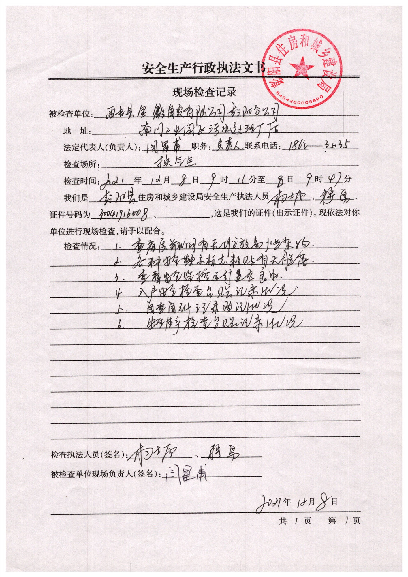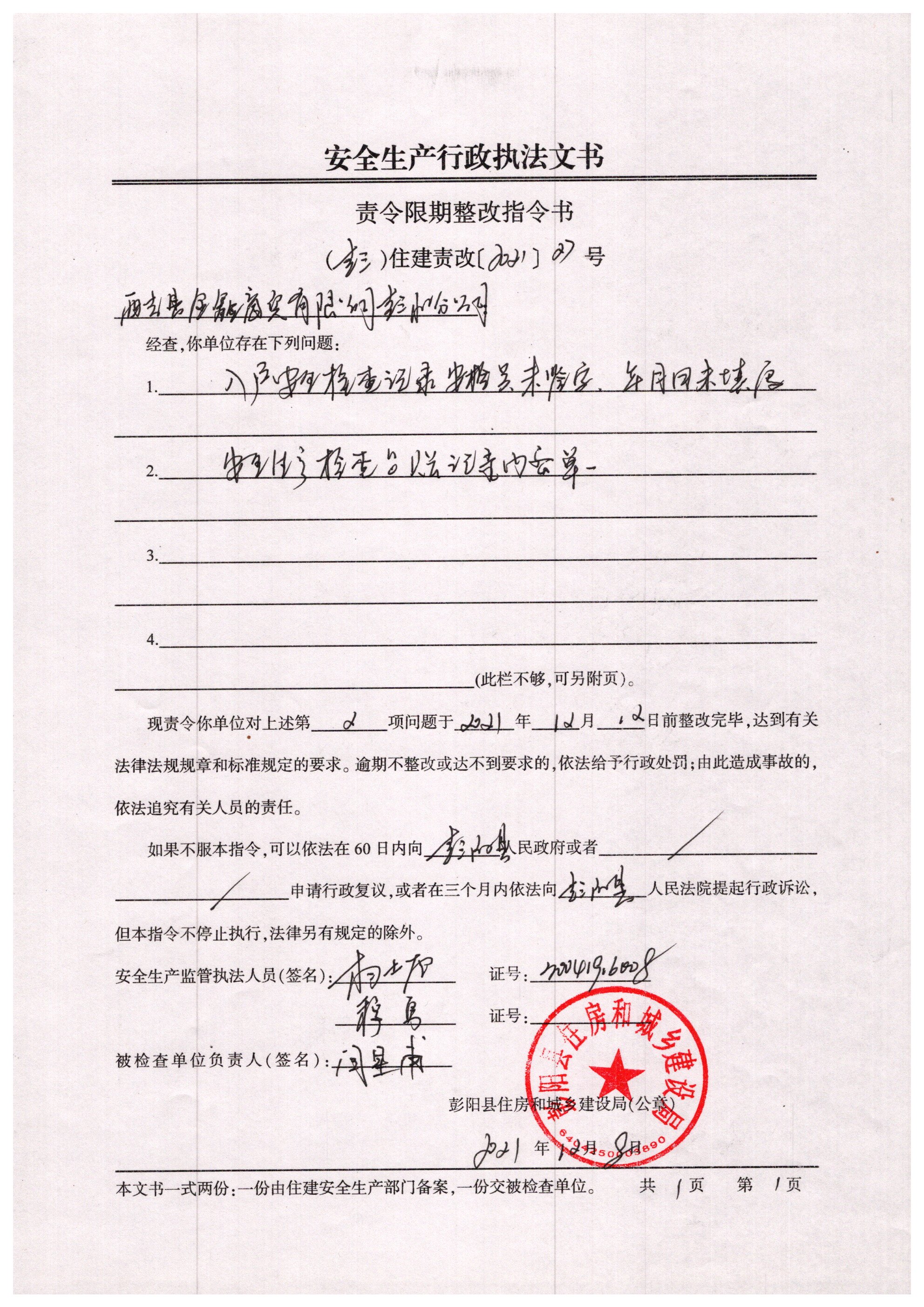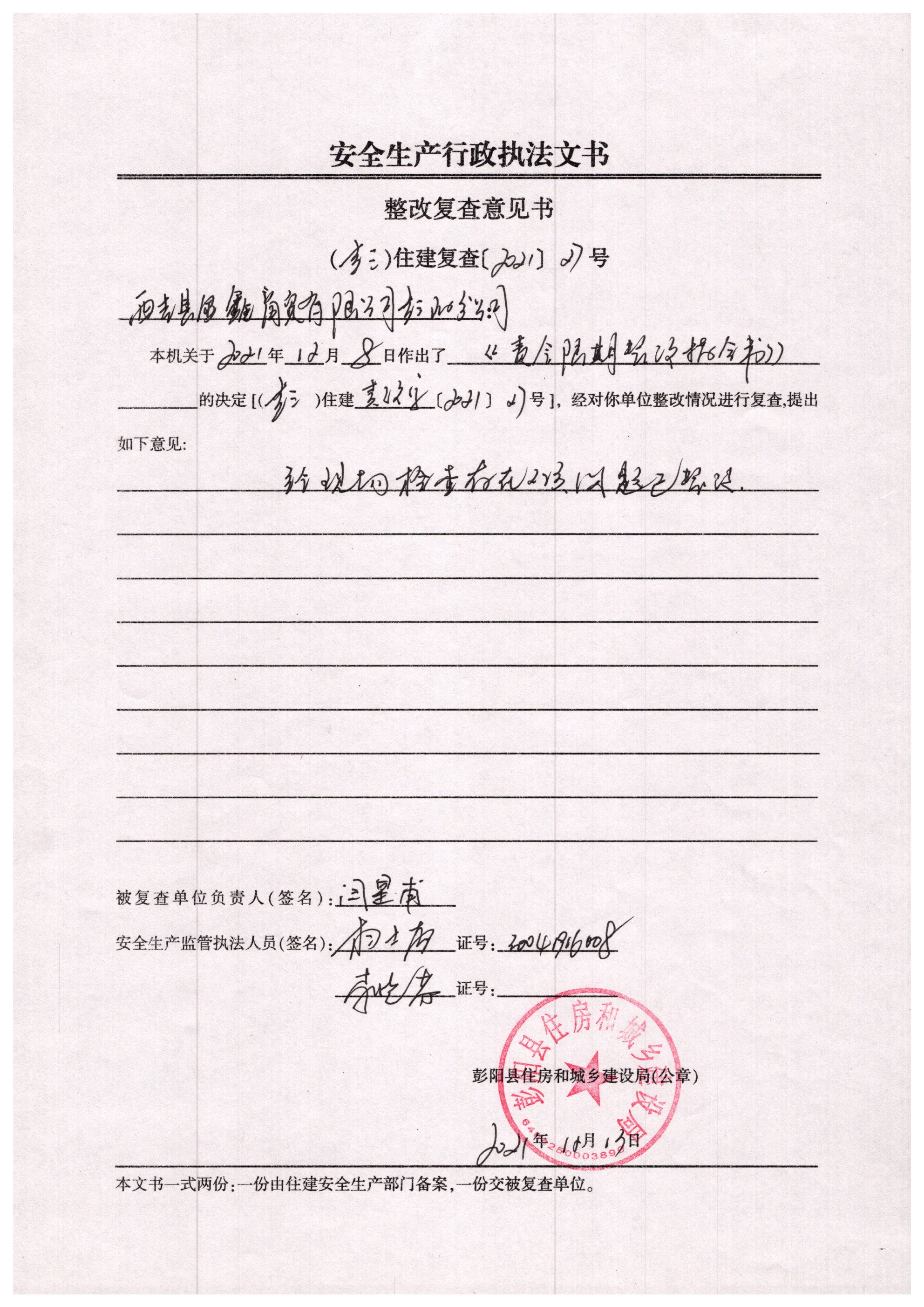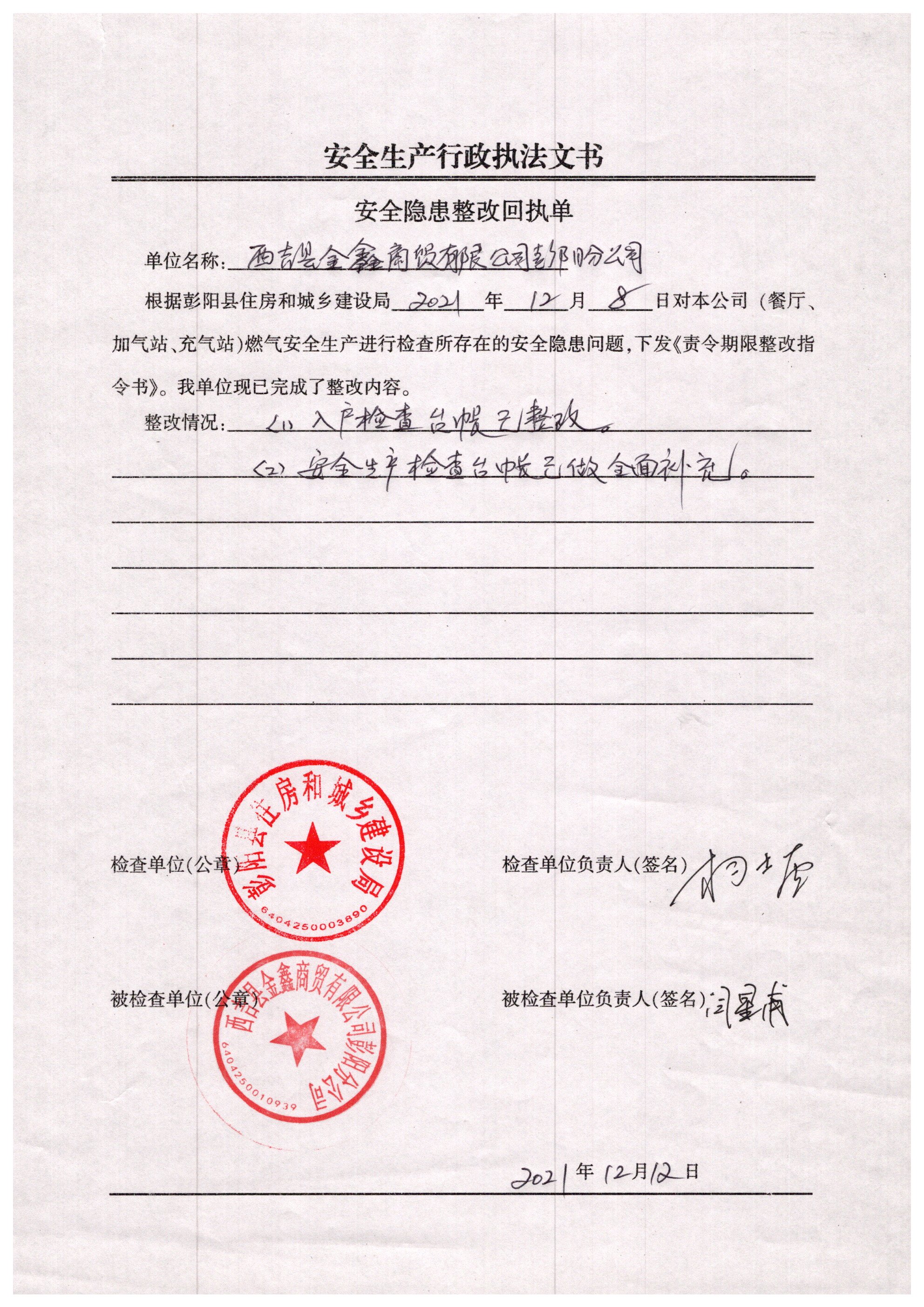 彭阳县住房城乡建设局对西吉县金鑫商贸有限公司彭阳分公司2021年12月燃气安全生产行政执法文书