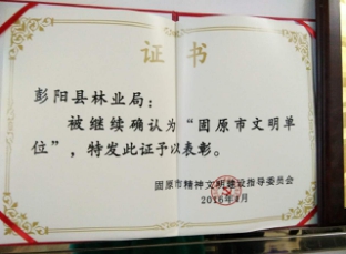 今年4月份,彭阳县林业局被固原市精神文明建设指导委员会继续确认为 “固原市文明单位”。这是继2011年12月被市精神文明建设指导委员会授予“2011-2014年度文明单位”后,该局又组织进行了重新申报。