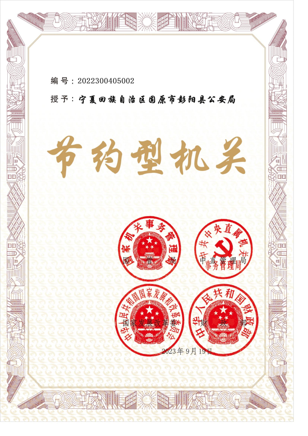 近日,彭阳县公安局被国家机关事务管理局、中共中央直属机关事务管理局、国家发展和改革委员会、财政部等四部门联合授予“节约型机关”称号。